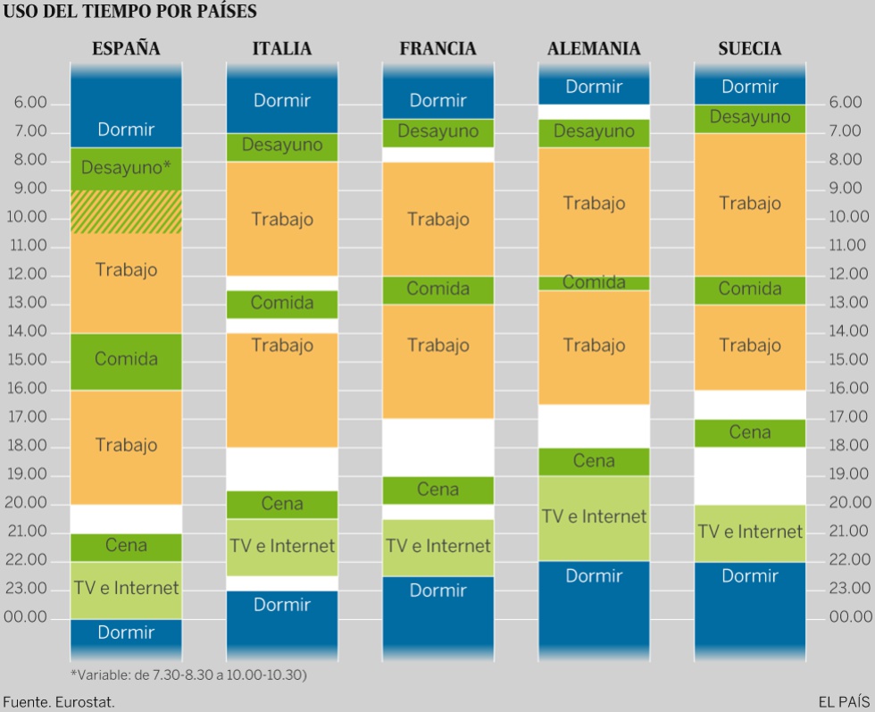 Mientras en España vemos El Ministerio del Tiempo o el programa líder de audiencia de la temporada, en Alemania están ya descansando en la cama. En Italia, donde han cenado a las 19.30- 20.00, están también en ello. Lo que a priori puede parecer una anécdota es, en la práctica, un retraso medio de dos horas que afecta a la organización diaria de todos los ámbitos de nuestra vida: el trabajo, la familia y el ocio.